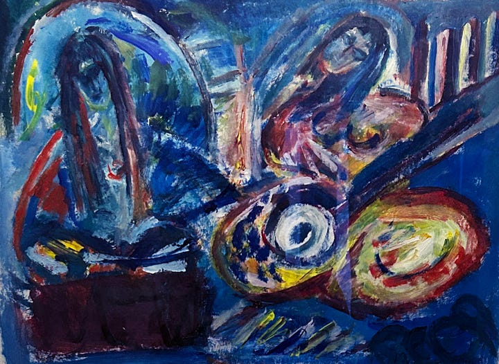 We hung one painting above the changing table in the baby’s room, and it is his most favorite thing to look at. It soothes him instantly. What is he seeing, with those newborn eyes? The swirls of paint depict two musicians, one playing harmonium, the other sitar—everything rendered in swoops and whorls of International Klein Blue.