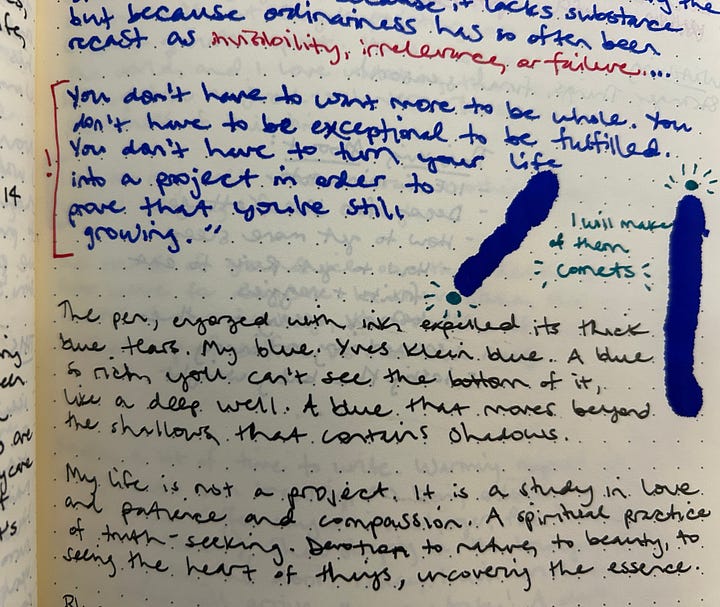My favorite blue pen exploded this morning while I was writing in my journal. In the past, I would have been upset with the ruined page, but since the New Year, I’ve resolved to let my journal be messier. If not there, then where? I write in multiple colors now, put things in brackets and boxes, doodle in the margins. At a time when I’m not making much art, I like the idea of my journal being a kind of daily art project, a creative practice, for no one’s eyes but mine. It doesn’t have to be perceived to be valid, I remind myself.